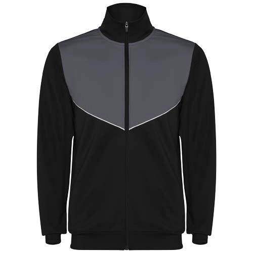 Artical number R64028P1 Evans unisex tracksuit Brand Roly Material Interlock knit of 100% Polyester, 225 g/m2 Colour Black / Green PMS color reference Black Weight 750 gram Country of origin MYANMAR Lead Time (Days) Default print option
