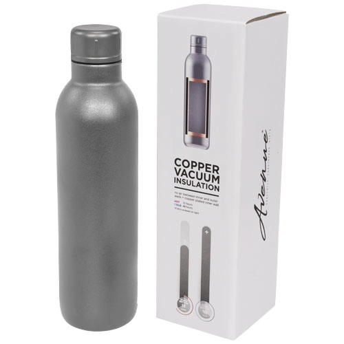 Durable, double wall stainless steel vacuum construction with copper insulation, which allows your beverage to stay cold for 48 hours and at least 12 hours for hot beverages. The construction also prevents condensation on the outside of the bottle. On-trend, durable powder coating. Stainless steel screw-on spill resistant lid. Volume capacity is 510ml. Presented in an Avenue gift box.Specs & Prices content